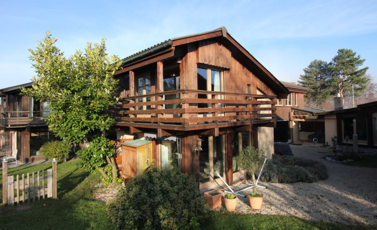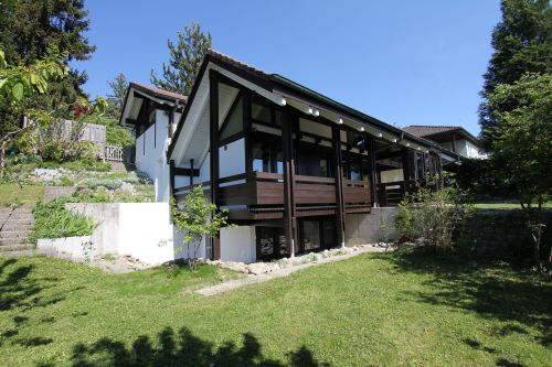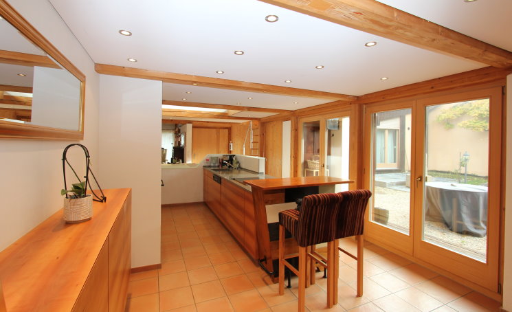 Über einen gedeckten und verglasten Vorplatz (Windfang) gelangt man ins Entrée oder in das separat zugängliche Gartenzimmer. Weiter befinden sich im Erdgeschoss die offene moderne Küche mit Vorratsraum, eine Nasszelle (Dusche/WC/Lavabo), ein heller Essbereich sowie ein geräumiger Wohnbereich mit einem gemütlichen Cheminée. Von hier gelangen Sie direkt in den grossen Garten.