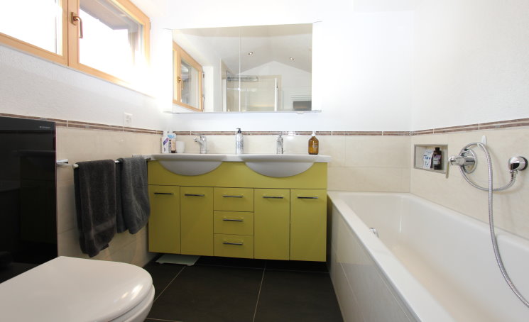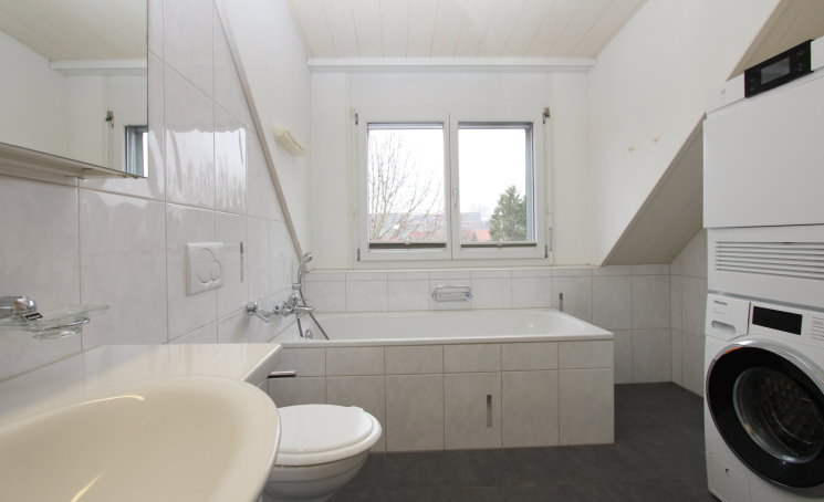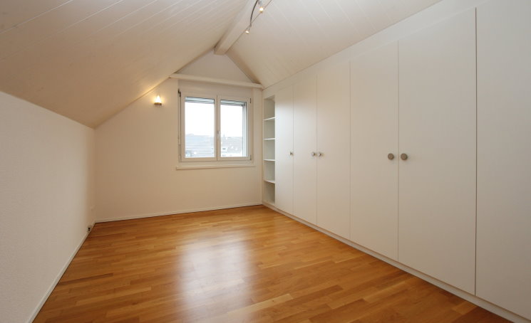 Das Obergeschoss ist über zwei Treppenaufgänge erreichbar. Hier sind ein grosses Schlafzimmer mit praktischem Ankleideraum, eine Nasszelle (Badewanne/Dusche/WC/Doppel-Lavabo), ein Zimmer und eine Galerie untergebracht. Die Abstellräume in den Dachräumen sorgen für viel Stauraum.