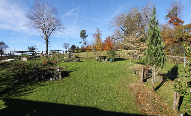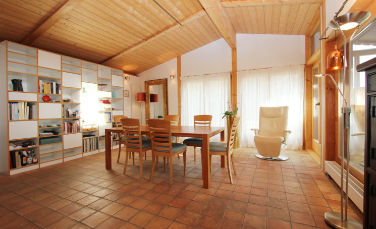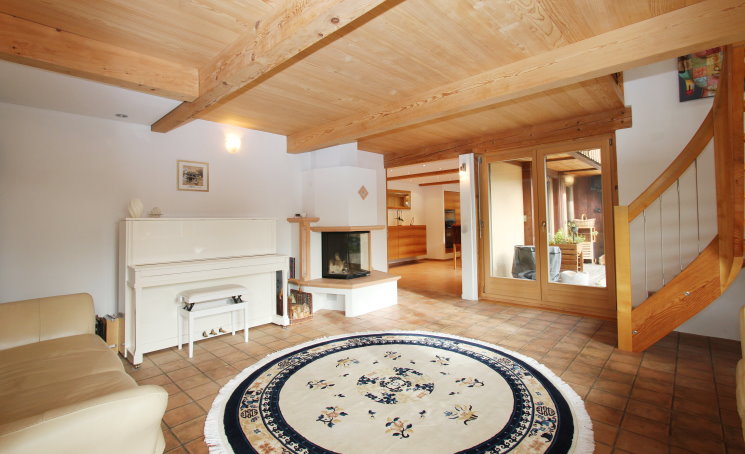 Über einen gedeckten und verglasten Vorplatz (Windfang) gelangt man ins Entrée oder in das separat zugängliche Gartenzimmer. Weiter befinden sich im Erdgeschoss die offene moderne Küche mit Vorratsraum, eine Nasszelle (Dusche/WC/Lavabo), ein heller Essbereich sowie ein geräumiger Wohnbereich mit einem gemütlichen Cheminée. Von hier gelangen Sie direkt in den grossen Garten.